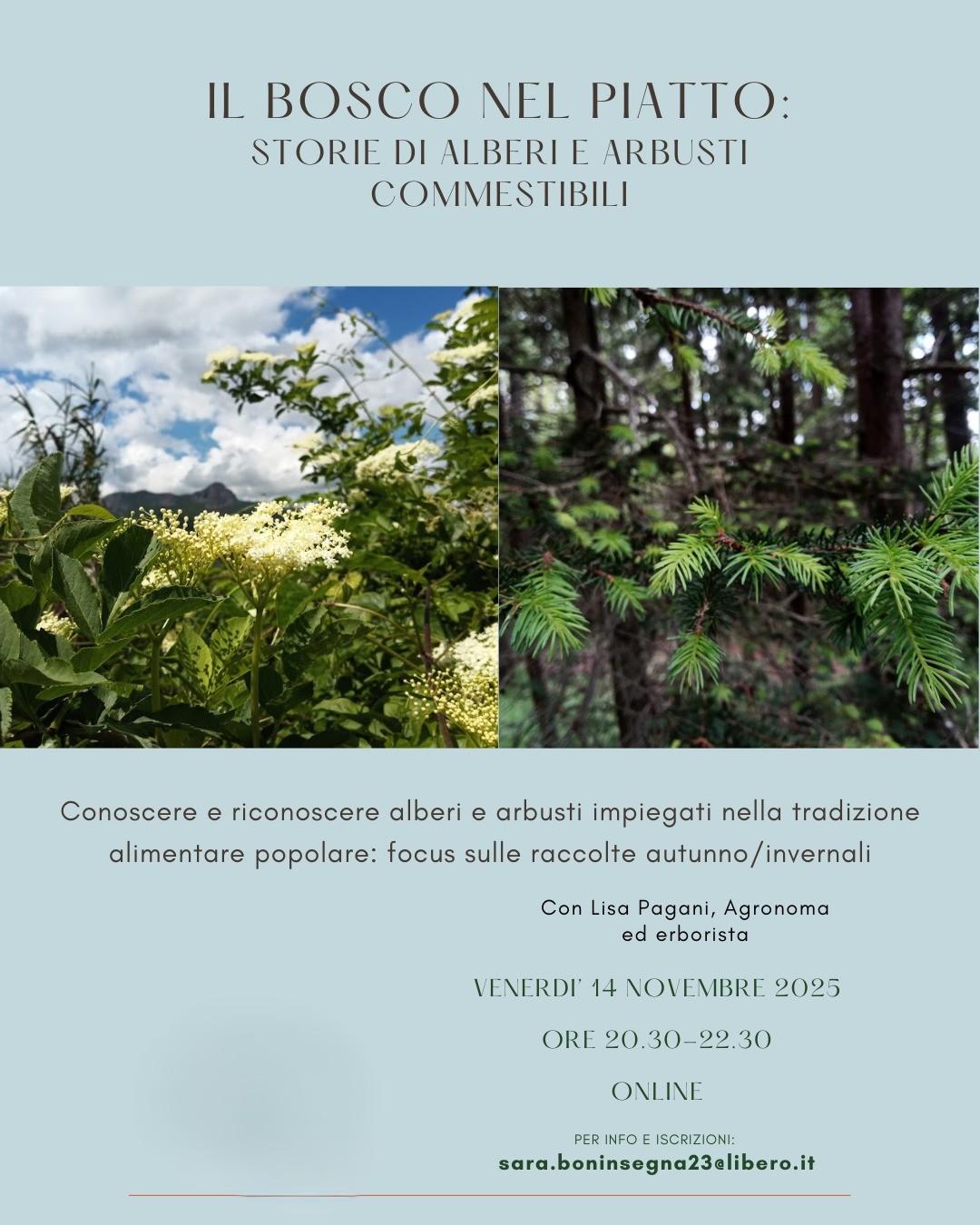 Durante il seminario, racconteremo alcune storie sull’impiego di specie arboree e arbustive presenti sul nostro territorio, impareremo ad effettuare il loro corretto riconoscimento ed indagheremo i loro molteplici utilizzi culinari.